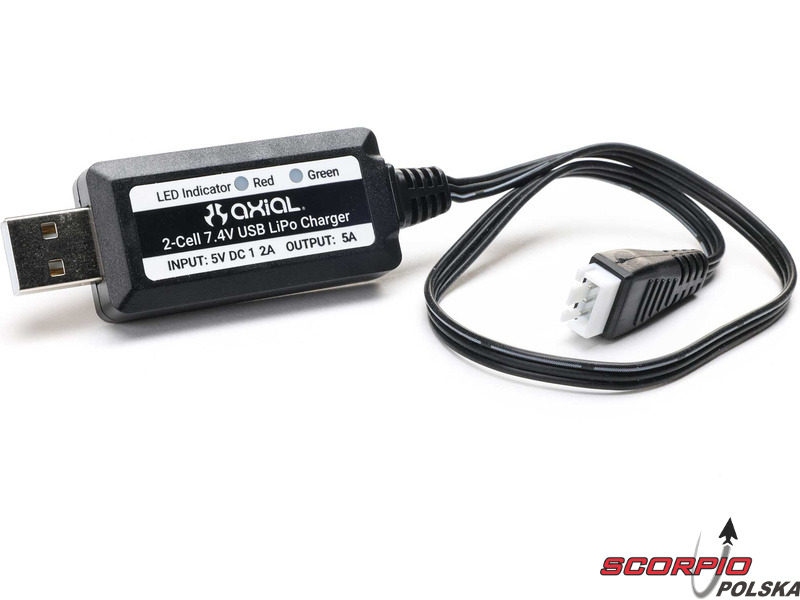 Prosta ładowarka Spektrum USB, do ładowania 2-ogniwowego akumulatora LiPol z 3-stykowym złączem PH2.54 JST-XH, ładuje prądem 500mA.