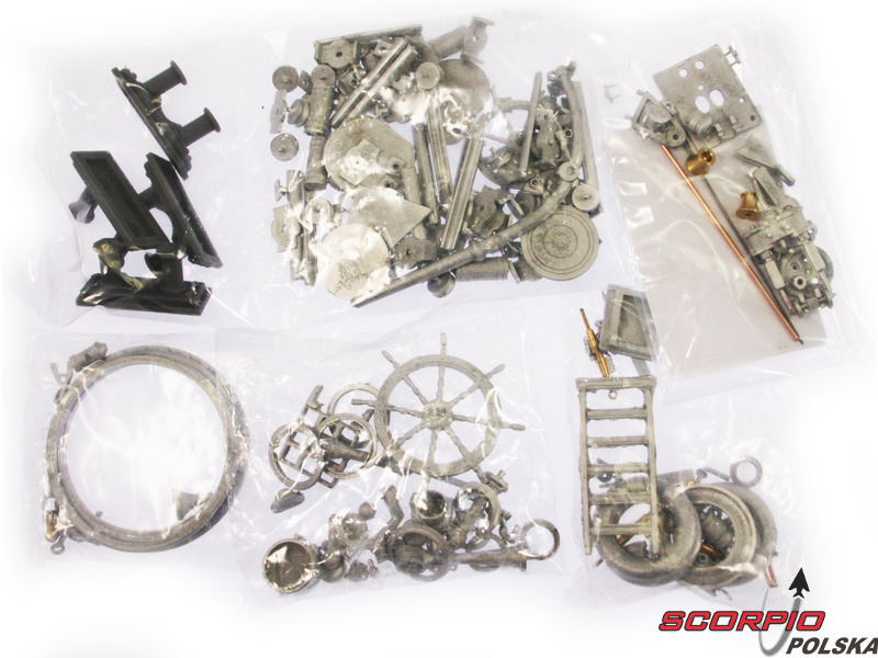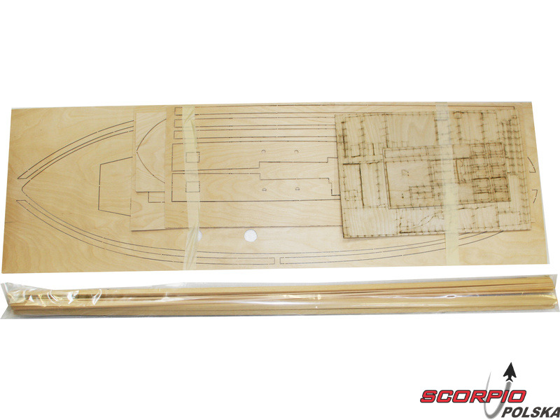 Po otwarciu pokrywy pudełka znajdziemy kadłub z włókna szklanego, drewniane części modelu wykonane ze sklejki, zestaw wyprasek, małe części zamknięte w woreczkach, zestaw rysunków i instrukcję.