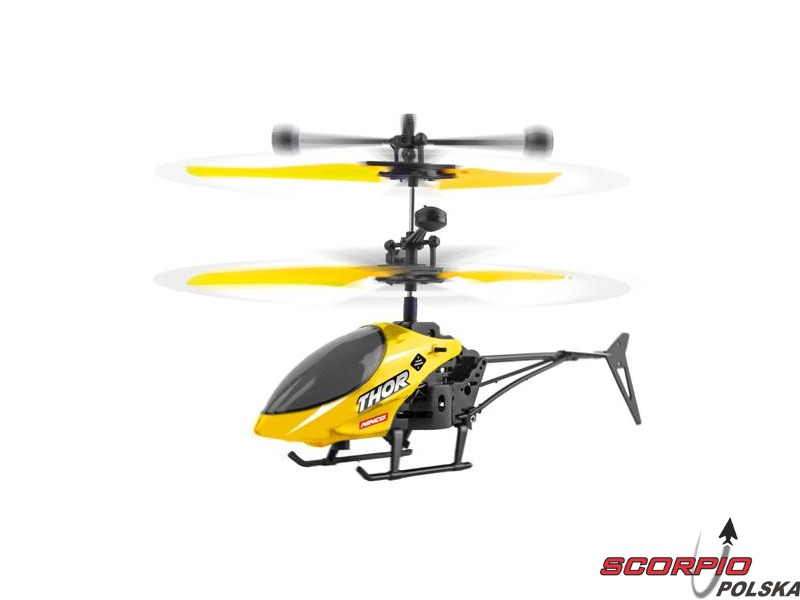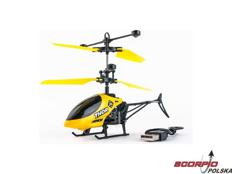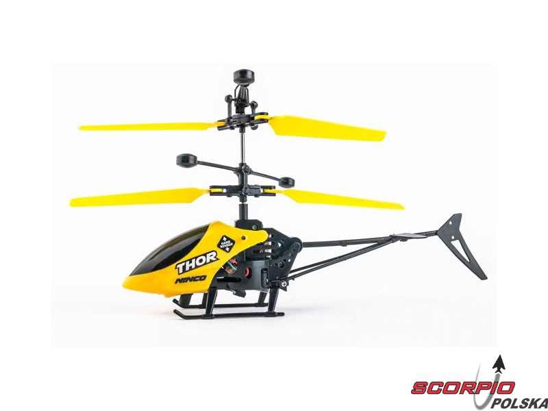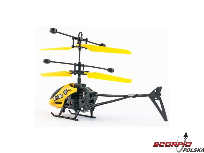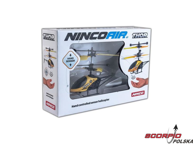Śmigłowiec RC NINCOAIR Thor firmy Ninco jest odpowiedni dla początkujących pilotów. Nie wymaga żadnego nadajnika , steruje się nim wyłącznie ręką. Po załączeniu sam wystartuje na daną wysokość. Kiedy ma polecieć jeszcze wyżej, wystarczy podłożyć pod niego rękę a on natychmiast zareaguje. Ten sposób sterowania najbardziej docenią dzieci. Dzięki zintegrowanemu żyroskopowi podczas lotu jest bardzo stabilny. Ze względu na małą masę jest przeznaczony głównie do latania wewnątrz. Śmigłowiec ma wytrzymała konstrukcję. Plastikowa karoseria ma żółty kolor. Dwa przeciwbieżne wirniki rozkręca silny silnik szczotkowy.
