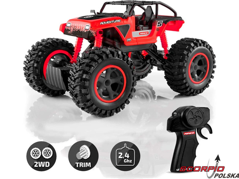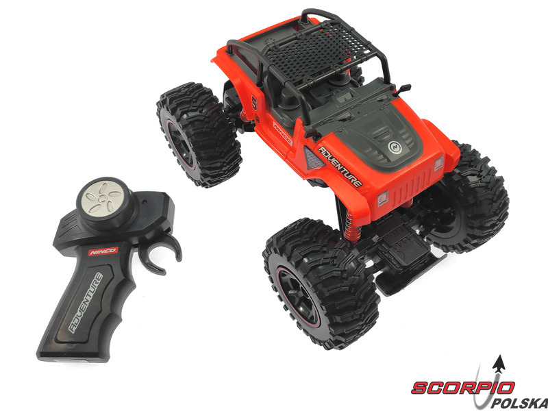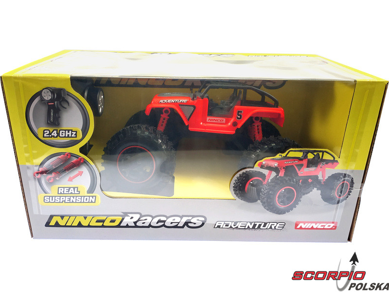 Opakowanie zawiera kompletnie zmontowany samochód RC NINCORACERS Adventure 2,4GHz RTR, zdalnie sterowany w skali 1:16, z napędem na tylne koła, nadajnik drążkowy 2,4GHz. Instrukcja obsługi w języku hiszpańskim, angielskim, portugalskim, niemieckim, francuskim, włoskim. Należy dokupić 3 baterie alkaliczne AA do samochodu i 2 baterie AAA do nadajnika.