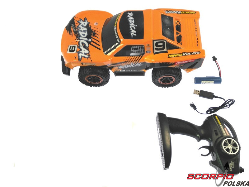 Zestaw zawiera samochód zdalnie sterowany NINCORACERS Radical, nadajnik pistoletowy 2,4GHz, akumulator litowo-jonowy 3,7 V 1300 mAh, ładowarkę USB. Instrukcja obsługi EN, ES, PT, DE, FR, IT, DK, NO, FI, SV, NE.