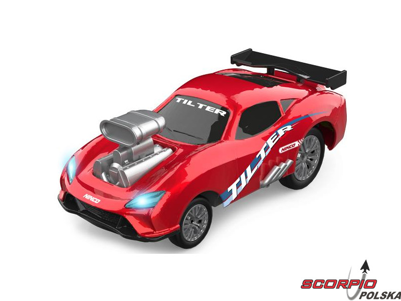 Samochód zdalnie sterowany NINCORACERS Tilter z karoserią, która przechyla się podczas skręcania, nadając mu wyścigowy efekt szybkiej jazdy. Model posiada przednie białe i tylne czerwone światła LED oraz designerską karoserię z makietą silnika. Samochód napędzany jest dwoma mniejszymi kołami umieszczonymi z tyłu pośrodku, które służą również do skręcania modelem. Prędkość samochodu wynosi do 15 km/h. Dołączony nadajnik pistoletowy 2,4GHz zapewnia sterowanie bez zakłóceń. Wszystko, co jest ważne dla działania, znajduje się w opakowaniu, w tym akumulator Li-ion 7,4V 500mAh i ładowarka USB. Wystarczy włożyć 2 baterie AA do nadajnika.