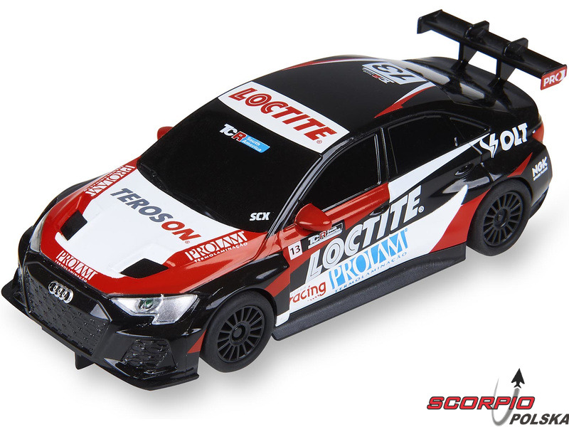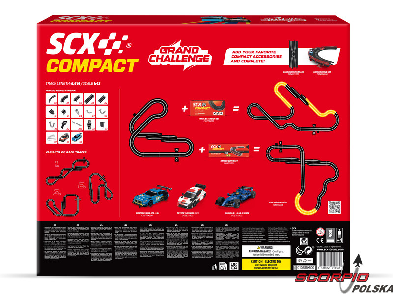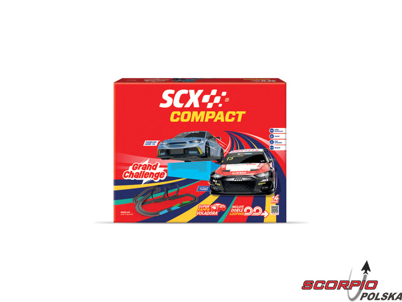 Tor wyścigowy SCX Compact Grand Challenge w skali 1:43 – analogowy tor wyścigowy z mostem, barierkami, 2 pętlami i skoczniami. Dwa bezprzewodowe kontrolery, dwa szczegółowe autka ze światłami, Audi RS3 LMS i Cupra. Powierzchnia do rozłożenia podstawowej wersji: 123 x 63 cm. Długość toru: 6,66 m. Montaż toru jest bardzo łatwy, poszczególne elementy toru wystarczy zatrzasnąć, podłączyć piloty i można rozpocząć wyścig.
