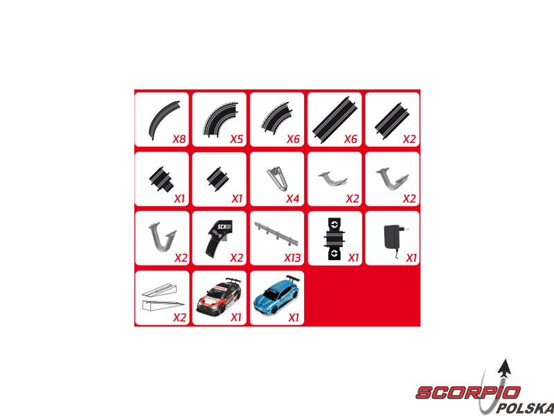 Zestaw zawiera elementy toru, most, barierki, podwójną pętlę, licznik, 2x skocznię, 2x autko torowe, 2x kontroler i zasilacz.