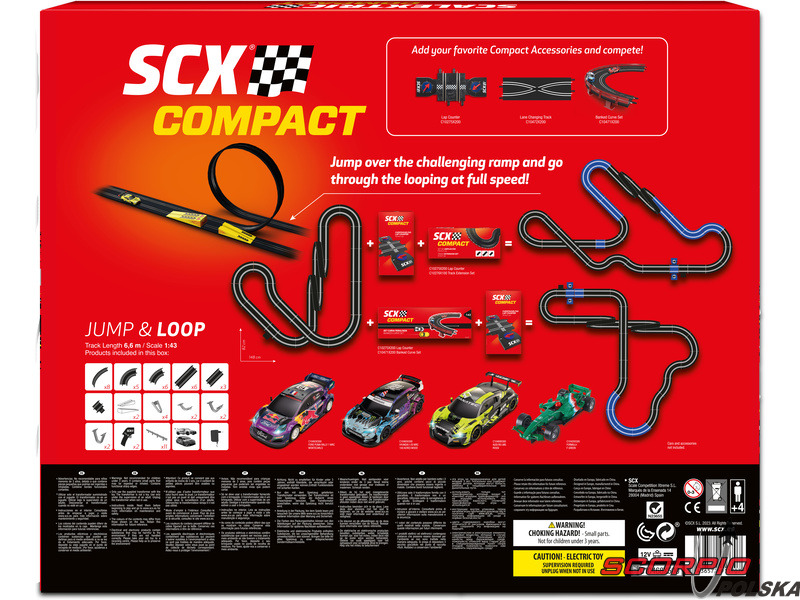 Tor wyścigowy SCX Compact Jump & Loop w skali 1:43 – analogowy elektryczny tor wyścigowy z prostymi, zakrętami, mostem, barierkami, kolorowymi krawężnikami, podwójną pętlą i skoczniami. Dwa bezprzewodowe kontrolery, dwa szczegółowe autka wyścigowe ze światłami, Cupra E-Racer Tambay i Porsche 911 GT3. Powierzchnia do rozłożenia podstawowej wersji: 148 x 82 cm. Długość toru: 6,6 m. Montaż toru jest bardzo prosty, poszczególne elementy toru wystarczy ze sobą złączyć, podłączyć kontrolery i można rozpocząć wyścig.