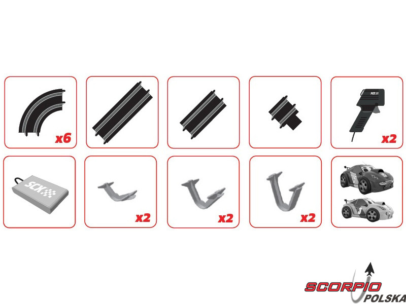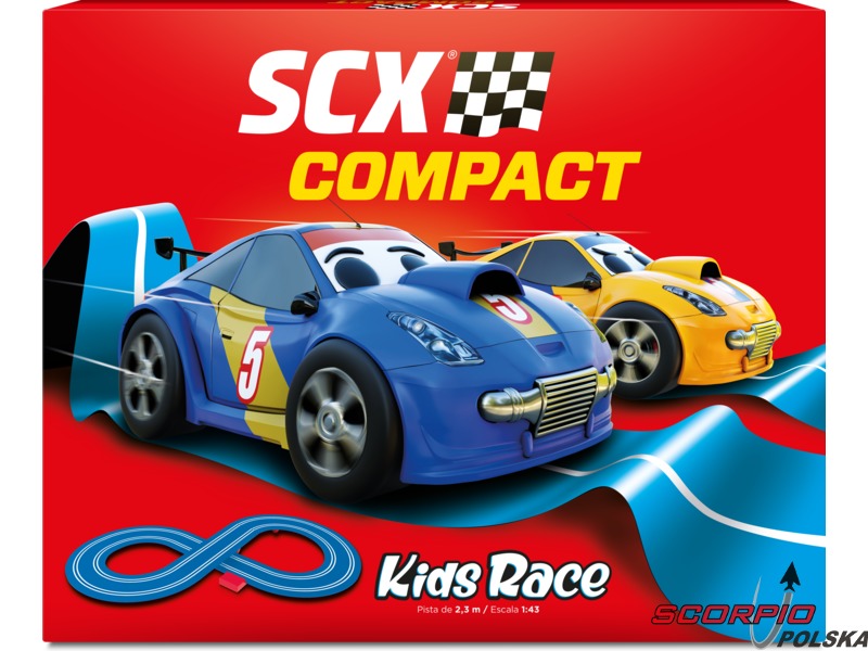Tor wyścigowy SCX Kids Race w skali 1:43 – analogowy, elektryczny, łatwy w obsłudze tor wyścigowy o klasycznym kształcie ósemki z mostem. Zasilanie za pomocą baterii AA. Zgodnie z ilustracją w instrukcji należy złożyć elementy toru, podłączyć sterowniki i włożyć 8 baterii AA. Autka mają zabawny, dziecięcy motyw. Powierzchnia rozłożenia: 94 x 45,6 cm. Długość toru: 2,3 m.