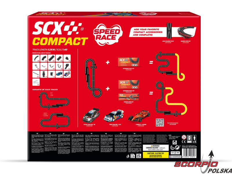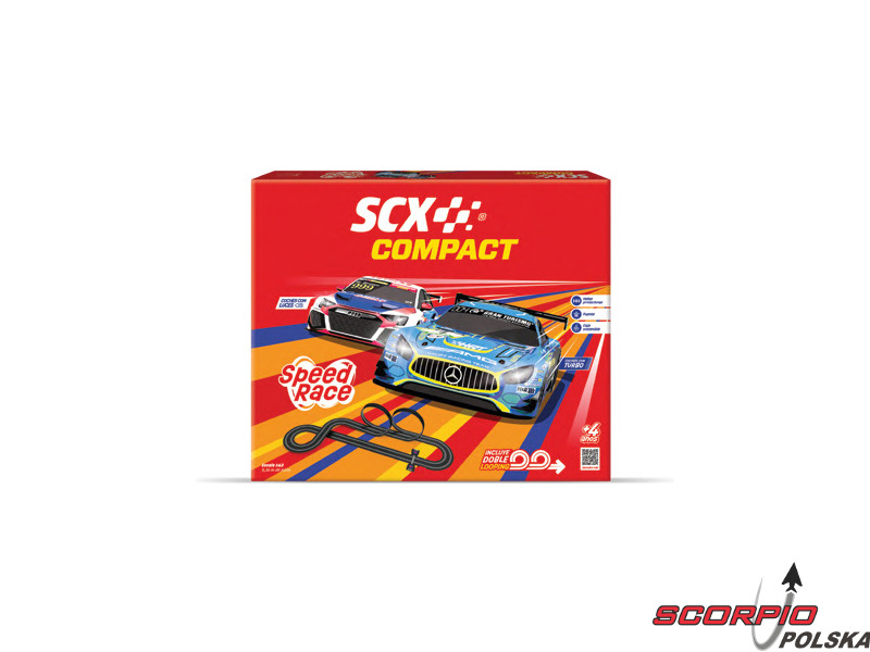 Tor wyścigowy SCX Compact Speed Race w skali 1:43 – analogowy tor wyścigowy z mostem, barierkami, 2 pętlami, skocznią i licznikiem okrążeń. Dwa ergonomiczne kontrolery, dwa szczegółowe autka wyścigowe ze światłami, Audi RS3 i Mercedes-Benz AMG GT3. Powierzchnia do rozłożenia podstawowej wersji: 180 x 80 cm. Długość toru: 5,36 m. Montaż toru jest bardzo łatwy, poszczególne elementy toru wystarczy zatrzasnąć, podłączyć kontrolery i można rozpocząć wyścig.