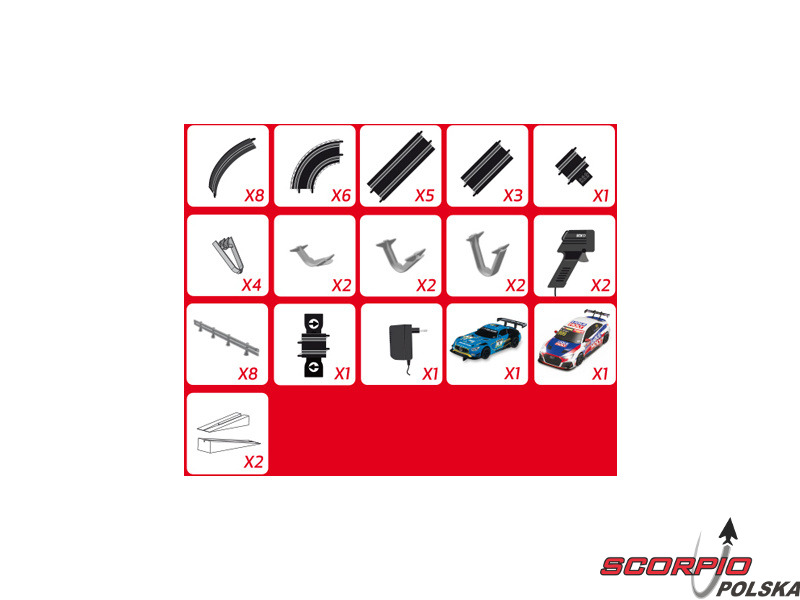 Zestaw zawiera elementy toru, most, barierki, podwójną pętlę, licznik okrążeń, 2x skocznię, 2x samochodzik torowy, 2x kontroler i zasilacz.