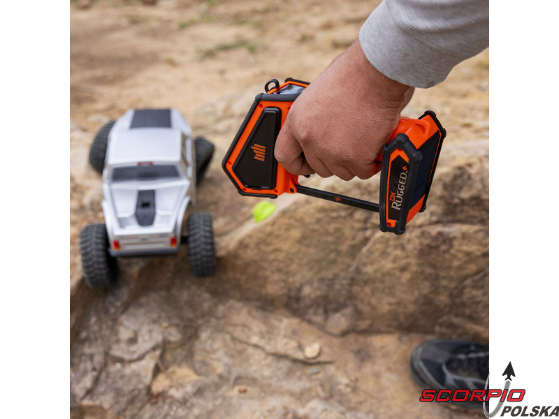 Nadajnik w wersji Rugged charakteryzuje się zwiększoną odpornością na uszkodzenia mechaniczne, a także znacznie zwiększoną odpornością na wilgoć. Zostanie to docenione nie tylko podczas jazdy modelami RC w trudnych warunkach, ale także podczas normalnego użytkowania. Nadajnik Rugged zawiera profilowane zderzaki z termoplastycznego poliuretanu (TPU), które otaczają obudowę i chronią ją przed upadkami, a także dotykowy interfejs sterowania, zabezpieczenie przed przewróceniem i solidną konstrukcję. Do poruszania się po menu nadajnika służy innowacyjny panel dotykowy, który zapewnia większą odporność na wilgoć i zabrudzenia. Wystarczy przesunąć palcem po panelu sterowania i kliknąć, aby wybrać opcję z menu. Podobnie jak jego poprzednik, nadajnik charakteryzuje się doskonałą ergonomią.