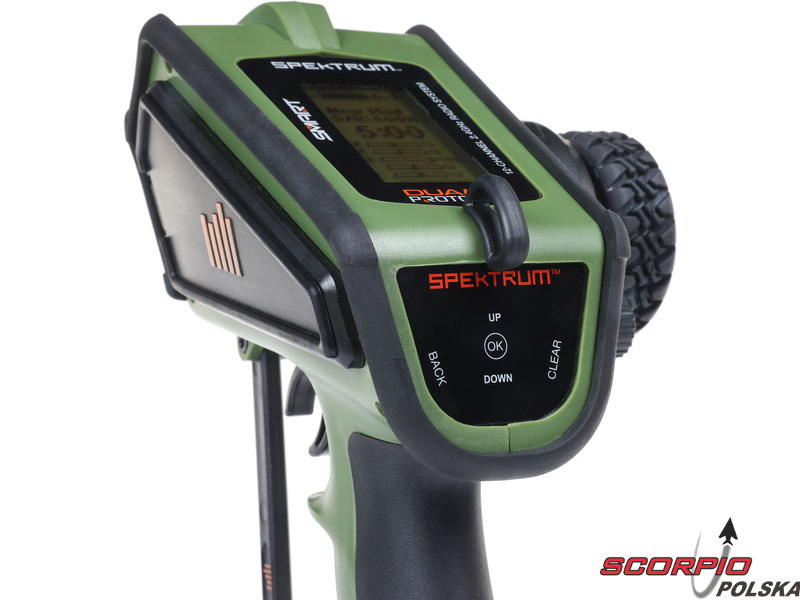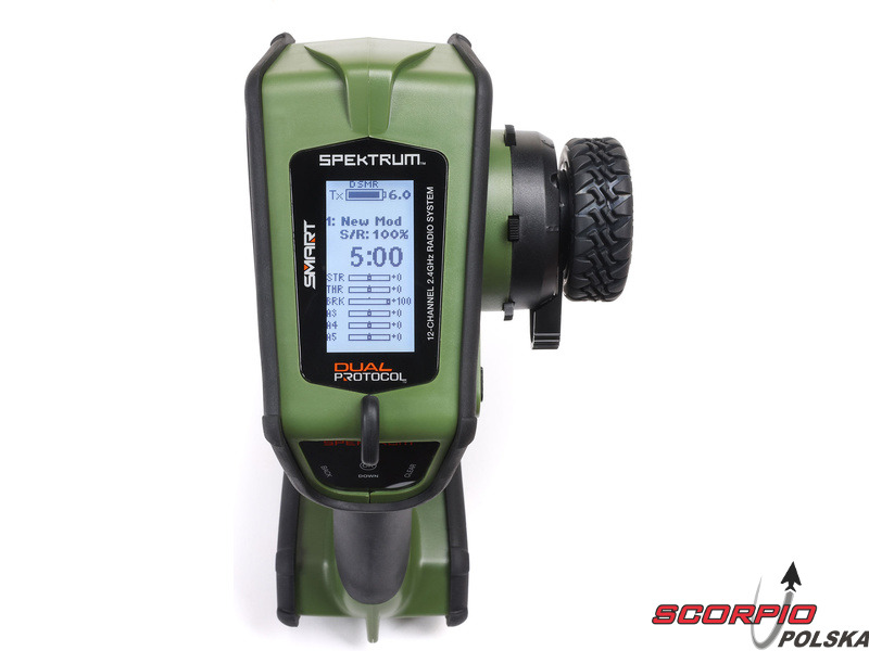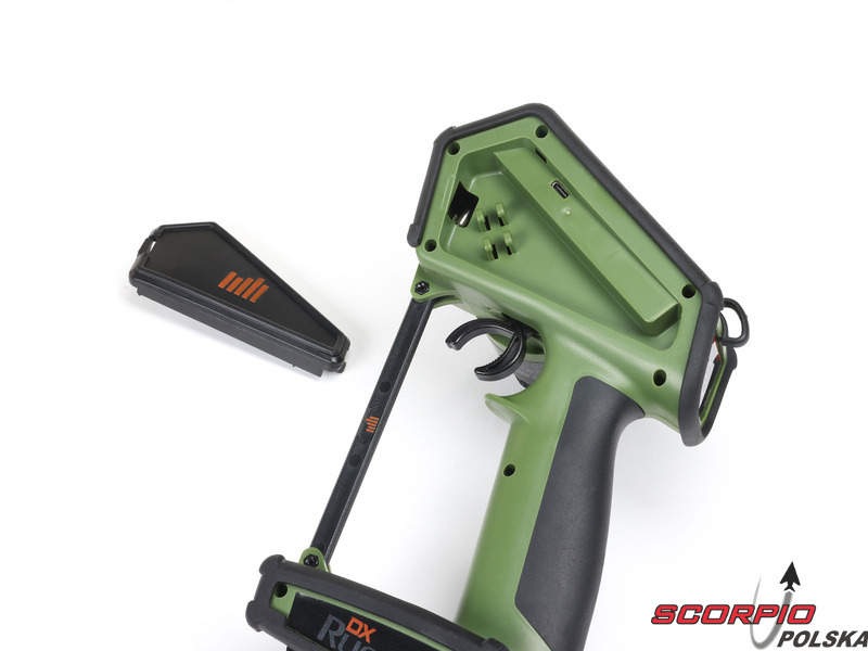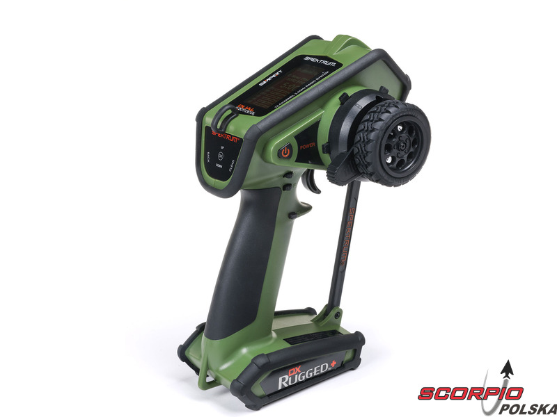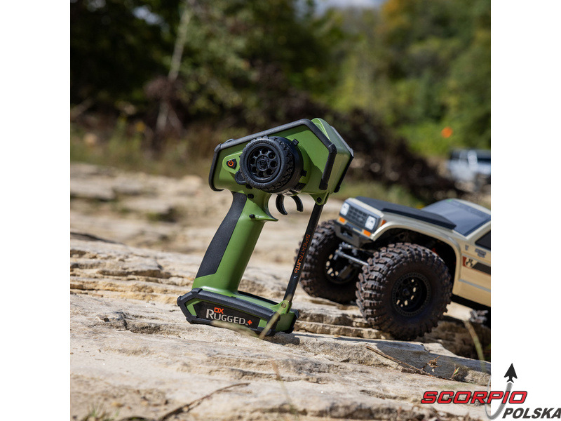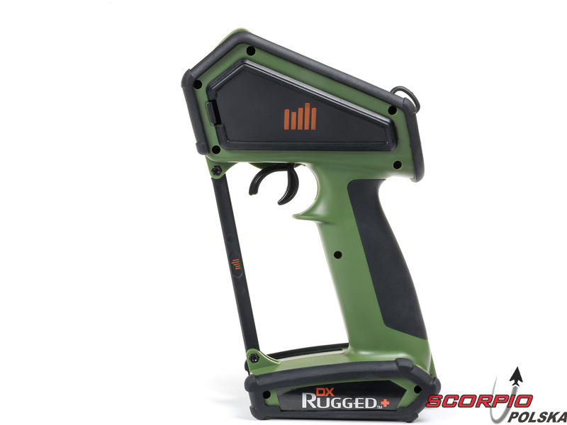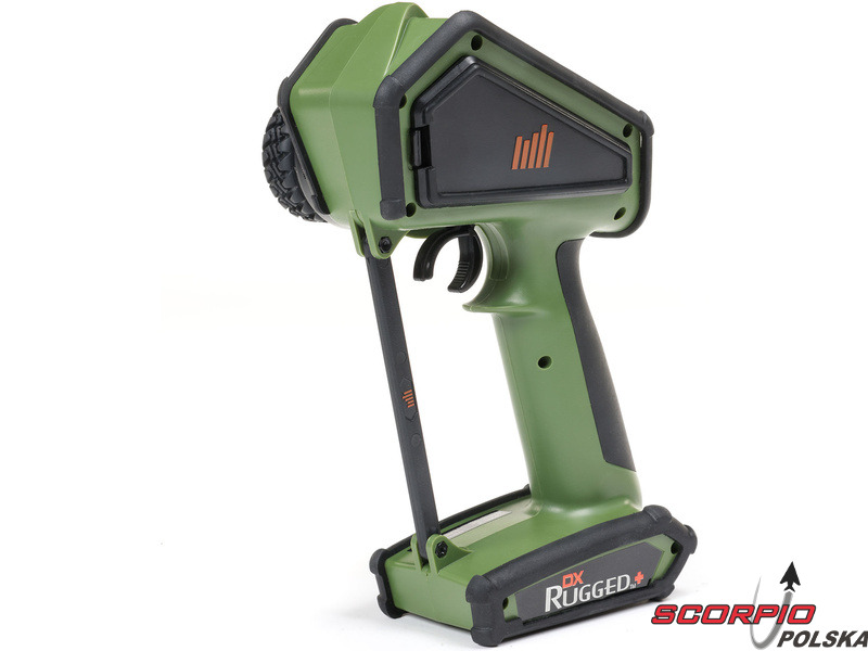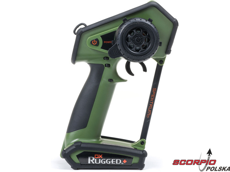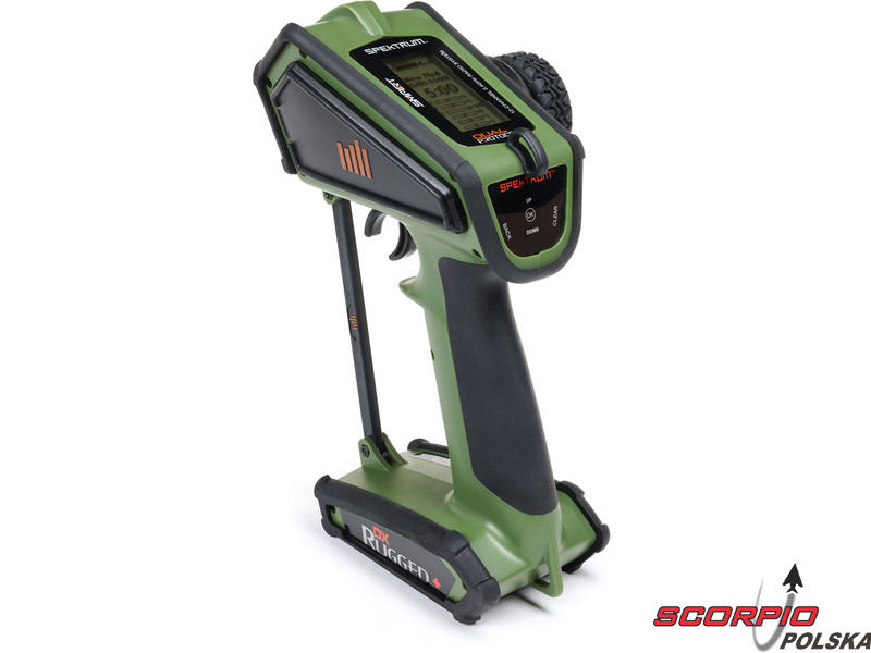 Pistoletowy 12-kanałowy nadajnik Spektrum DX Rugged+ zielony z podwójnym protokołem DSMR+ i SLT, który umożliwia sterowanie szeroką gamą modeli RC z wieloma funkcjami. Nadajnik zawiera technologię Spektrum Smart, a przy użyciu dodatkowych komponentów Spektrum zyskuje się doskonały przegląd modelu, w tym dane telemetryczne i możliwość bezpośredniego ustawienia regulatora Firma Prog. Nadajnik ma proste i logicznie zorganizowane menu, pamięć na 20 modeli, duży, przejrzysty wyświetlacz i niewielką masę. Wśród nowych funkcji wersji DSMR+ znajduje się obsługa wielu różnych mikserów, przełączników logicznych, hamulca awaryjnego, a także możliwość zmiany wejść i wykonywania innych zaawansowanych operacji programowania.