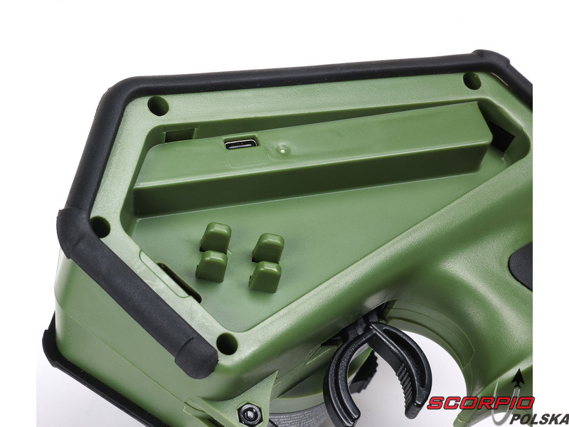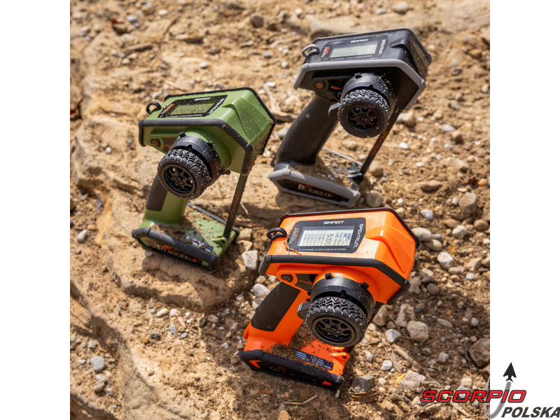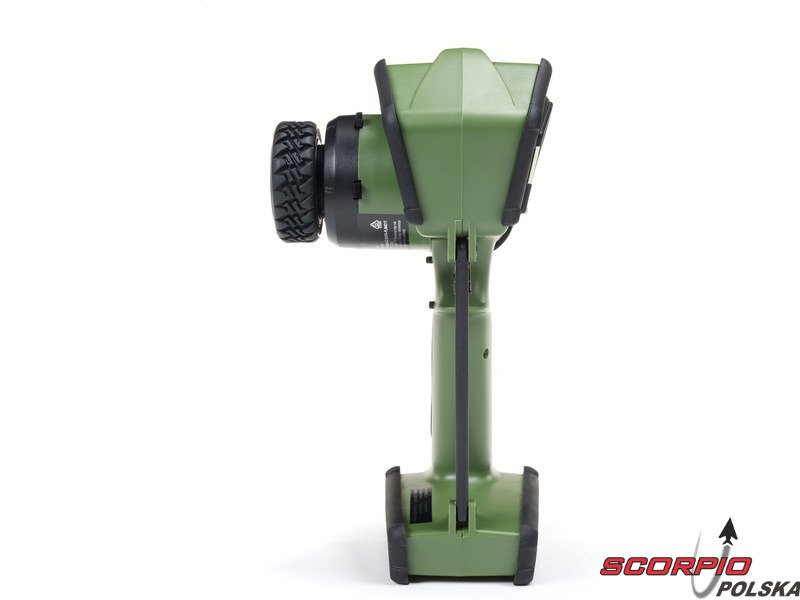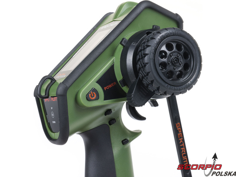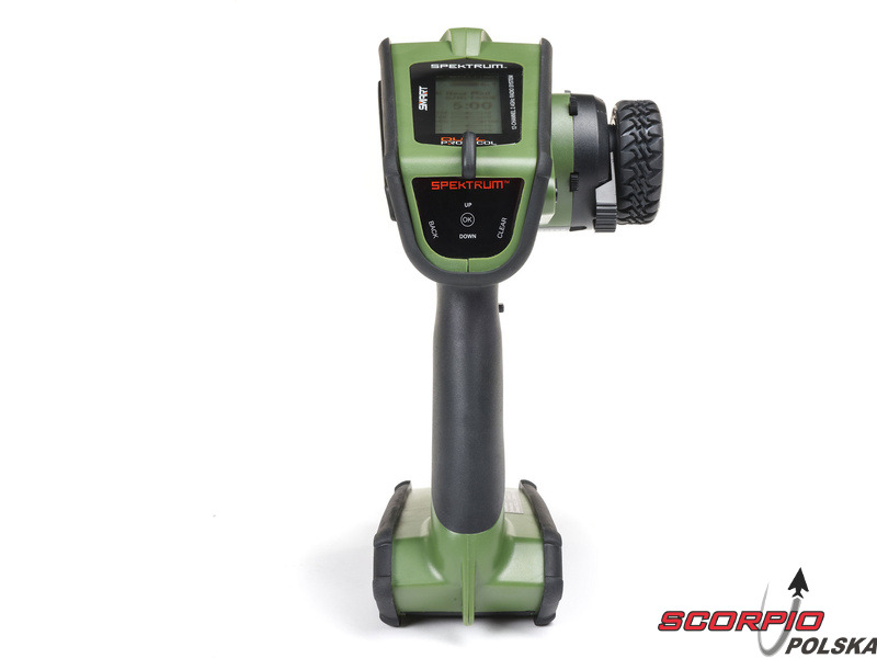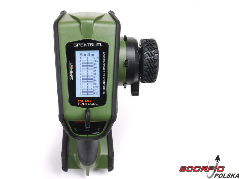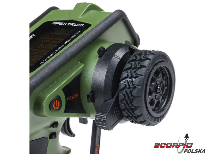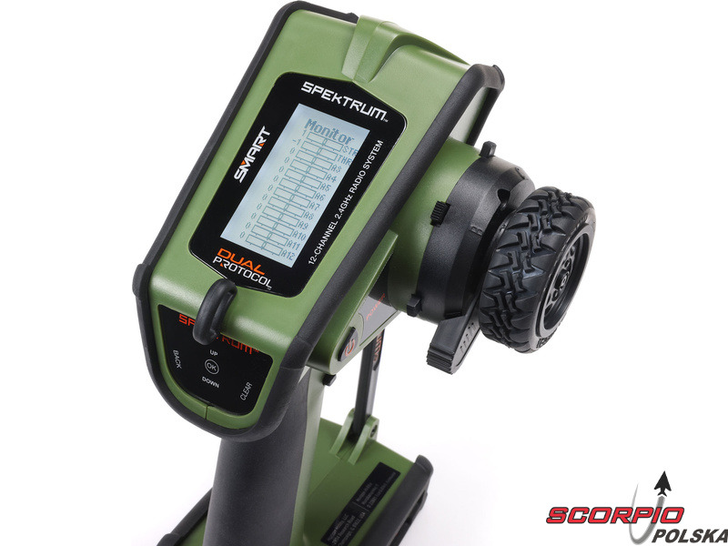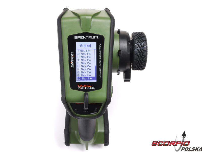 Pistoletowy 12-kanałowy nadajnik Spektrum DX Rugged+ zielony z podwójnym protokołem DSMR+ i SLT, który umożliwia sterowanie szeroką gamą modeli RC z wieloma funkcjami. Nadajnik zawiera technologię Spektrum Smart, a przy użyciu dodatkowych komponentów Spektrum zyskuje się doskonały przegląd modelu, w tym dane telemetryczne i możliwość bezpośredniego ustawienia regulatora Firma Prog. Nadajnik ma proste i logicznie zorganizowane menu, pamięć na 20 modeli, duży, przejrzysty wyświetlacz i niewielką masę. Wśród nowych funkcji wersji DSMR+ znajduje się obsługa wielu różnych mikserów, przełączników logicznych, hamulca awaryjnego, a także możliwość zmiany wejść i wykonywania innych zaawansowanych operacji programowania.