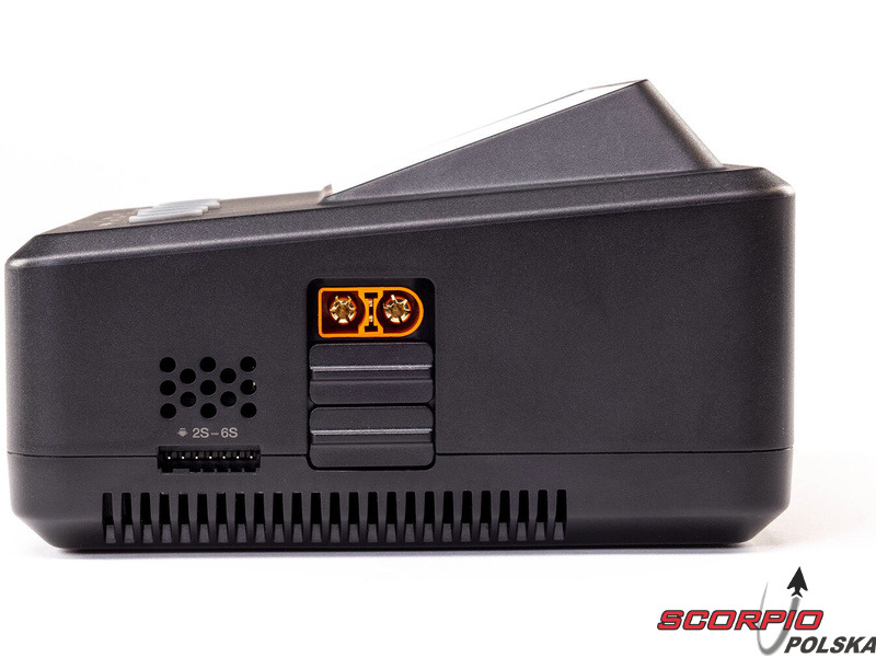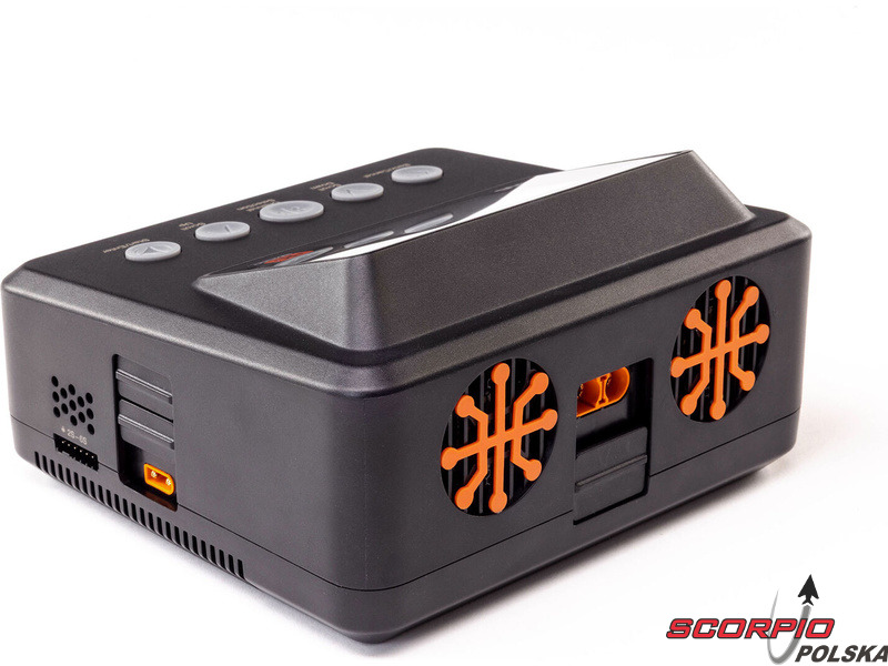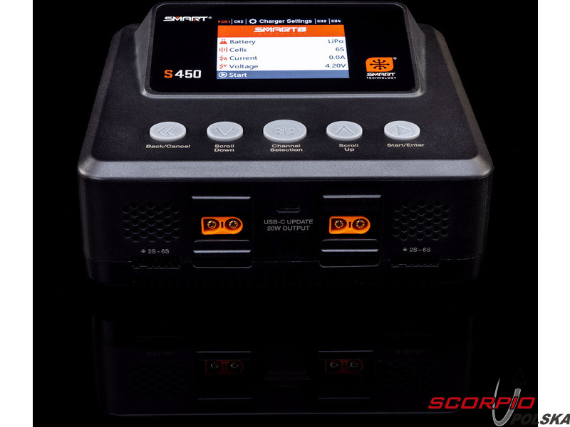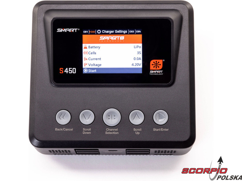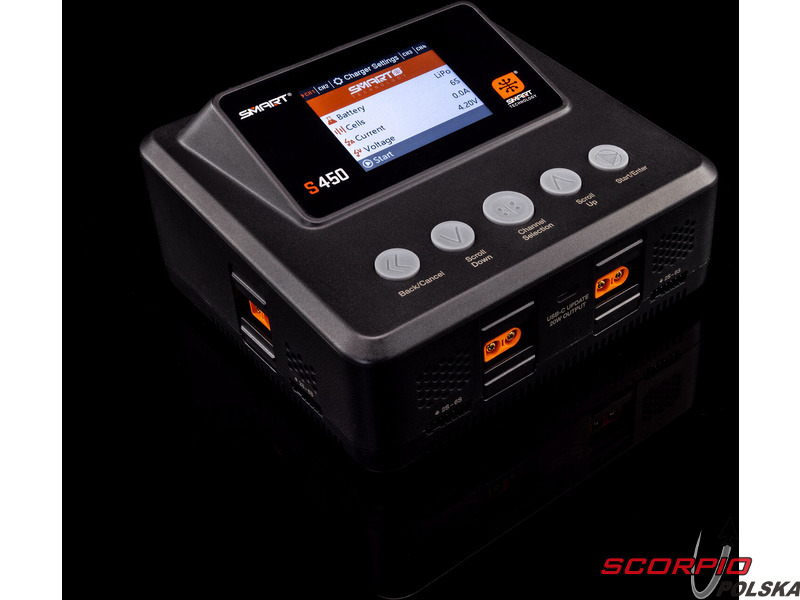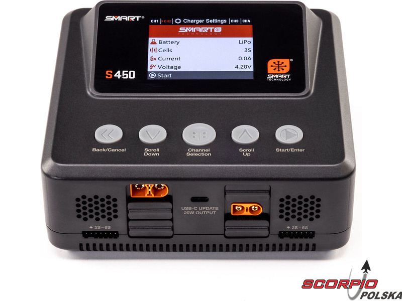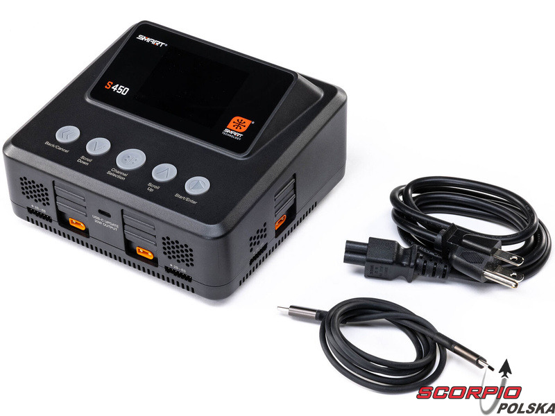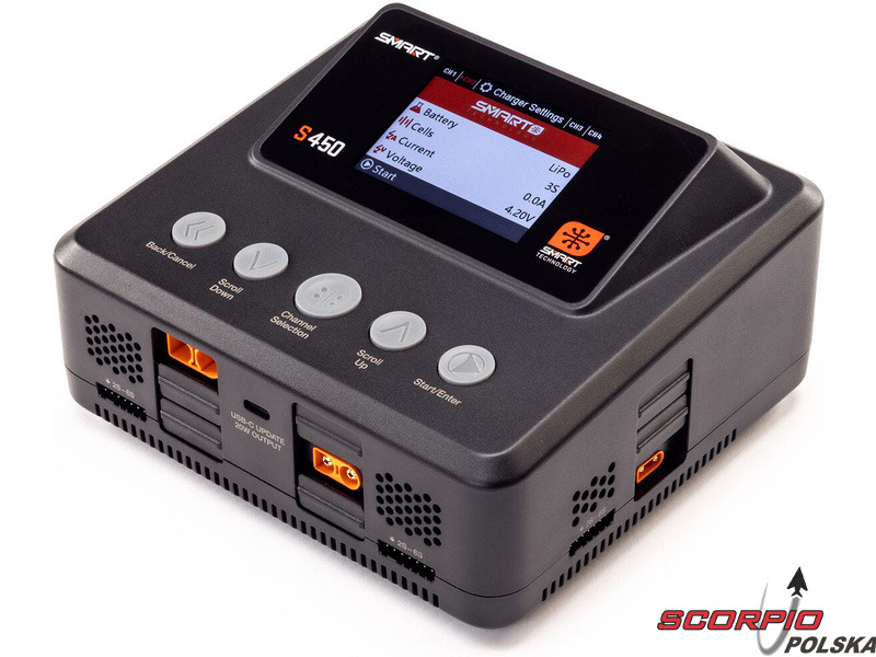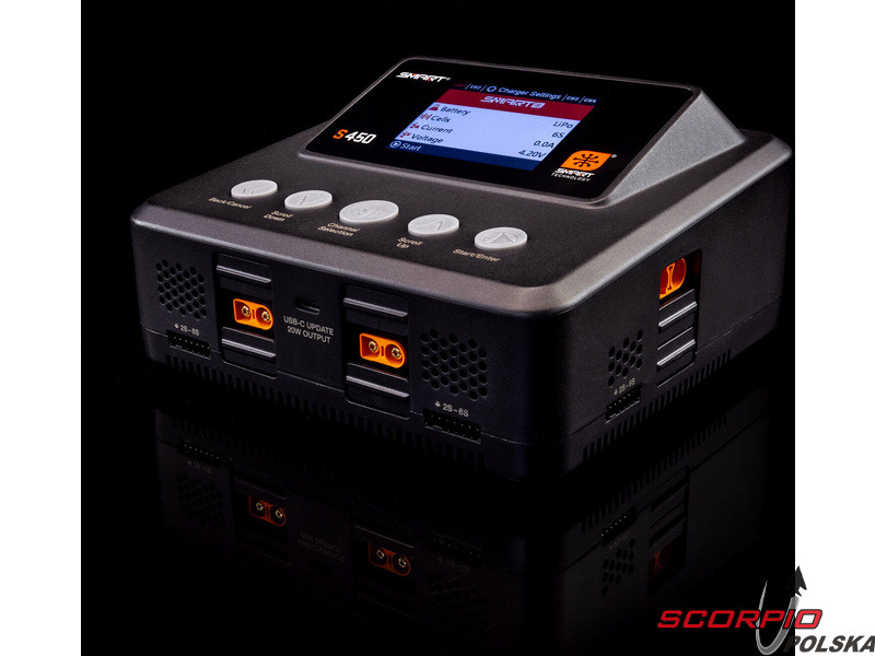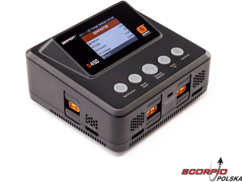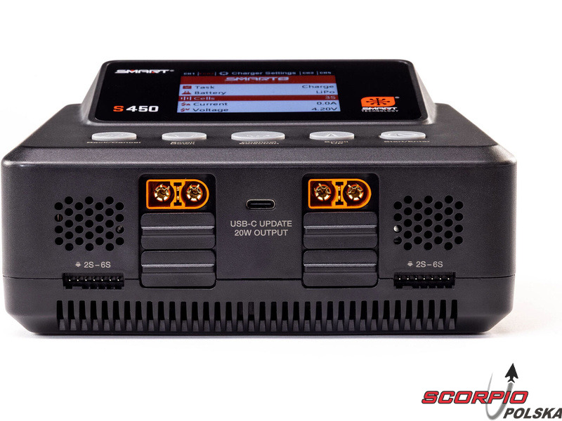 Ładowarka Spektrum Smart S450 G2 ładuje zarówno standardowe akumulatory, jak i akumulatory Spektrum SMART serii G1 i G2. Obsługiwane typy akumulatorów to LiFe/LiIon/LiPo (1–6 ogniw), NiMH/NiCd (1–16 ogniw) oraz Pb (1–12 ogniw). Port USB-C umożliwia ładowanie urządzeń dodatkowych oraz aktualizację oprogramowania ładowarki, dzięki czemu użytkownik zawsze dysponuje najnowszą wersją. Oprócz złączy IC każde wyjście wyposażone jest w złącze JST-XH do balansowania ogniw. Ładowarka oferuje klasyczne funkcje – ładowanie, ładowanie do napięcia przechowywania (Storage), rozładowywanie (30 W). Kompaktowa konstrukcja ładowarki jest uzupełniona 2,8-calowym kolorowym wyświetlaczem LCD. Interfejs menu jest intuicyjny, czytelny i wygodny w obsłudze za pomocą przycisków.