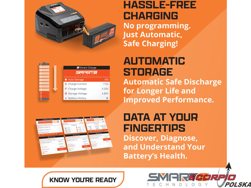 W przypadku ładowania akumulatorów Spektrum SMART obsługa jest niezwykle prosta i bezpieczna. Ładowarka automatycznie odczytuje wszystkie informacje z akumulatora Smart i ładowanie rozpoczyna się automatycznie. Nie trzeba niczego konfigurować. Podczas ładowania na ekranie głównym wyświetlane są podstawowe dane, w tym prędkość ładowania, poziom naładowania w procentach oraz pozostały czas ładowania. Ponadto użytkownik otrzymuje dostęp do wszystkich informacji zapisanych w układzie elektronicznym akumulatora. Można wyświetlić historię akumulatora, w tym liczbę cykli i stany krytyczne. Za pomocą ładowarki można również ustawić w akumulatorach Smart funkcję autostorage, czyli określić, po jakim czasie mają one zacząć się rozładowywać do napięcia przechowywania, lub wyłączyć tę funkcję.
