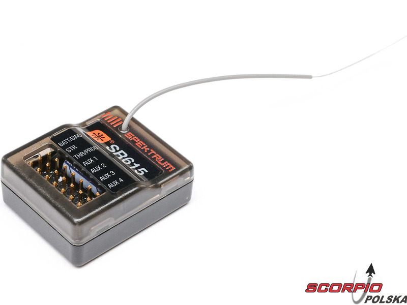 6-kanałowy odbiornik Spektrum SR615 DSMR 2,4 GHz w wersji mikro, z prędkością ramkową 5,5 ms, zapewnia szybsze połączenie z niewielkim opóźnieniem. Możliwość wyboru SmartSafe™ lub „Gas” Failsafe. Wodoodporna konstrukcja. Obsługa transmisji telemetrii Smart. Parowanie za pomocą konektora parującego.