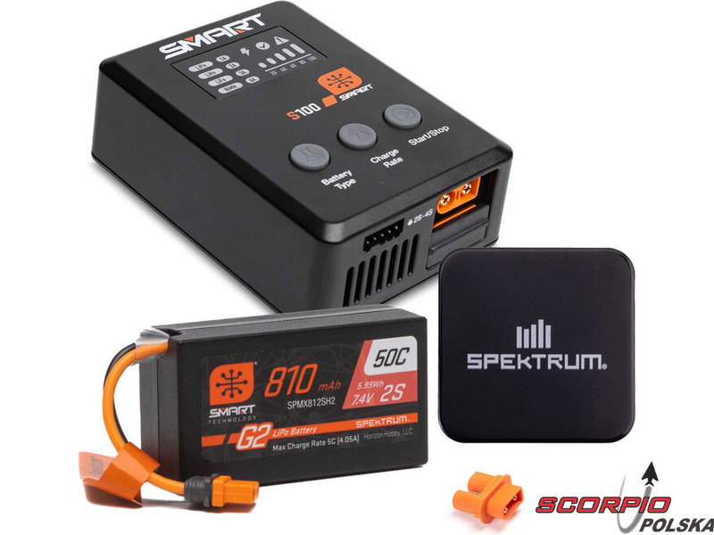 W zestawie znajduje się ładowarka Spektrum S100 1x100W USB-C, kabel USB-C 60 W, adapter USB-C, akumulator Spektrum Smart G2 LiPo 7,4 V 810 mAh 50C HC IC2, redukcja IC2/IC3, instrukcja obsługi.